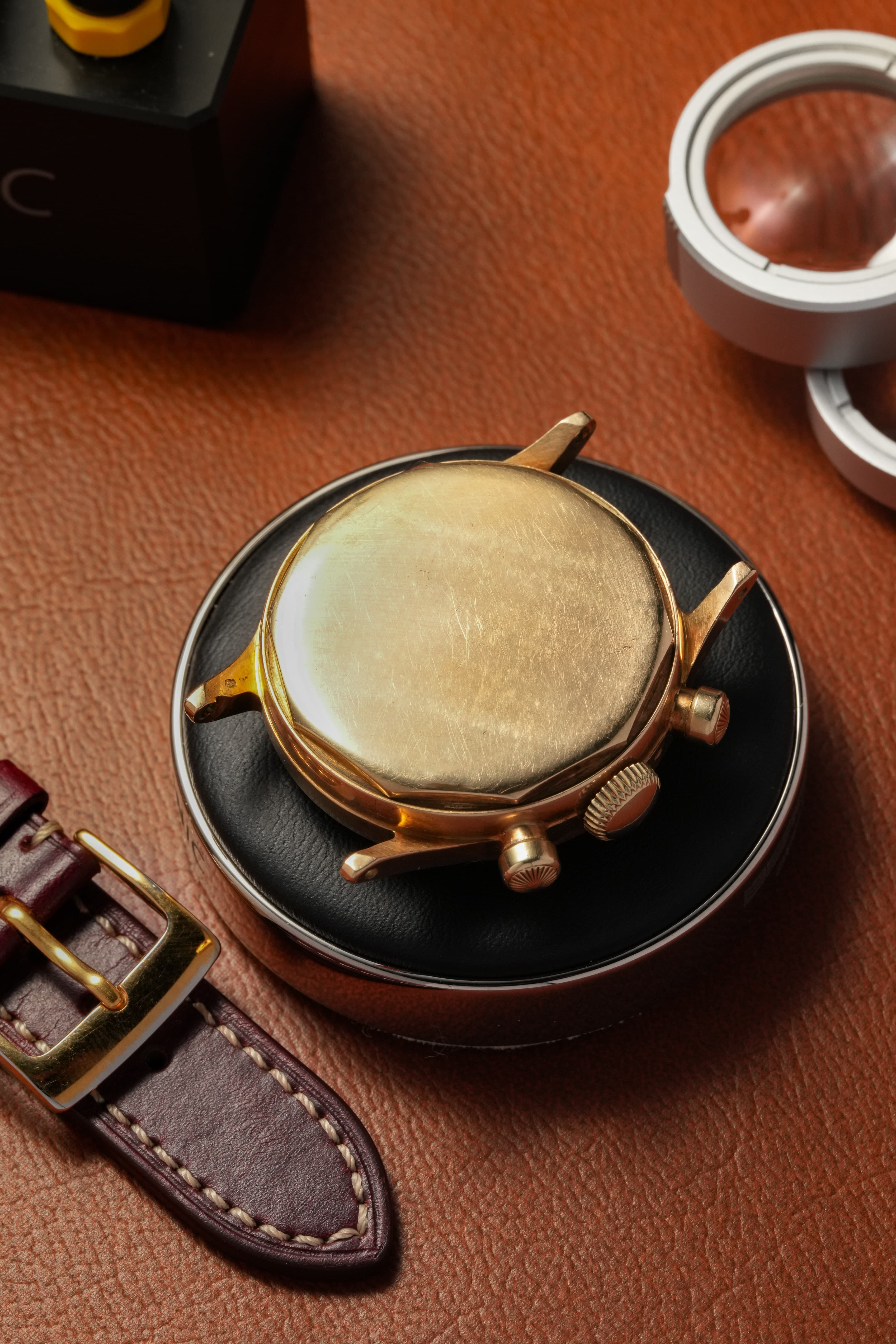Le boîtier étanche à fond décagonal vissé est ainsi l'œuvre de Taubert et Fils, successeurs du légendaire François Borgel. Les connaisseurs reconnaîtront immédiatement les poussoirs « soleil » surdimensionnés et la couronne cannelée : ce sont les mêmes composants que ceux de la Patek Philippe réf. 1463, premier chronographe étanche de la maison genevoise – les fameux « Tasti Tondi » qui atteignent aujourd'hui des sommes considérables aux enchères. À l'intérieur du boîtier, une cage antimagnétique composée d'un anneau entourant le mouvement et d'un capot anti-poussière protège le calibre. L'intérieur du fond de boîte révèle l'ensemble des marquages de la marque, du numéro de boîtier, du numéro de brevet britannique pour ce boîtier étanche, d'un marquage d'or 14 carats / 585 ‰, du poinçon suisse d'or 14 carats (écureuil et G pour le bureau douanier de Genève), et de la clé de Genève n°11 pour le fabricant Taubert Frères. En outre, les 4 derniers chiffres du numéro de boîte sont de nouveau gravés entre les cornes, à 6 heures – et demeurent extrêmement profonds.