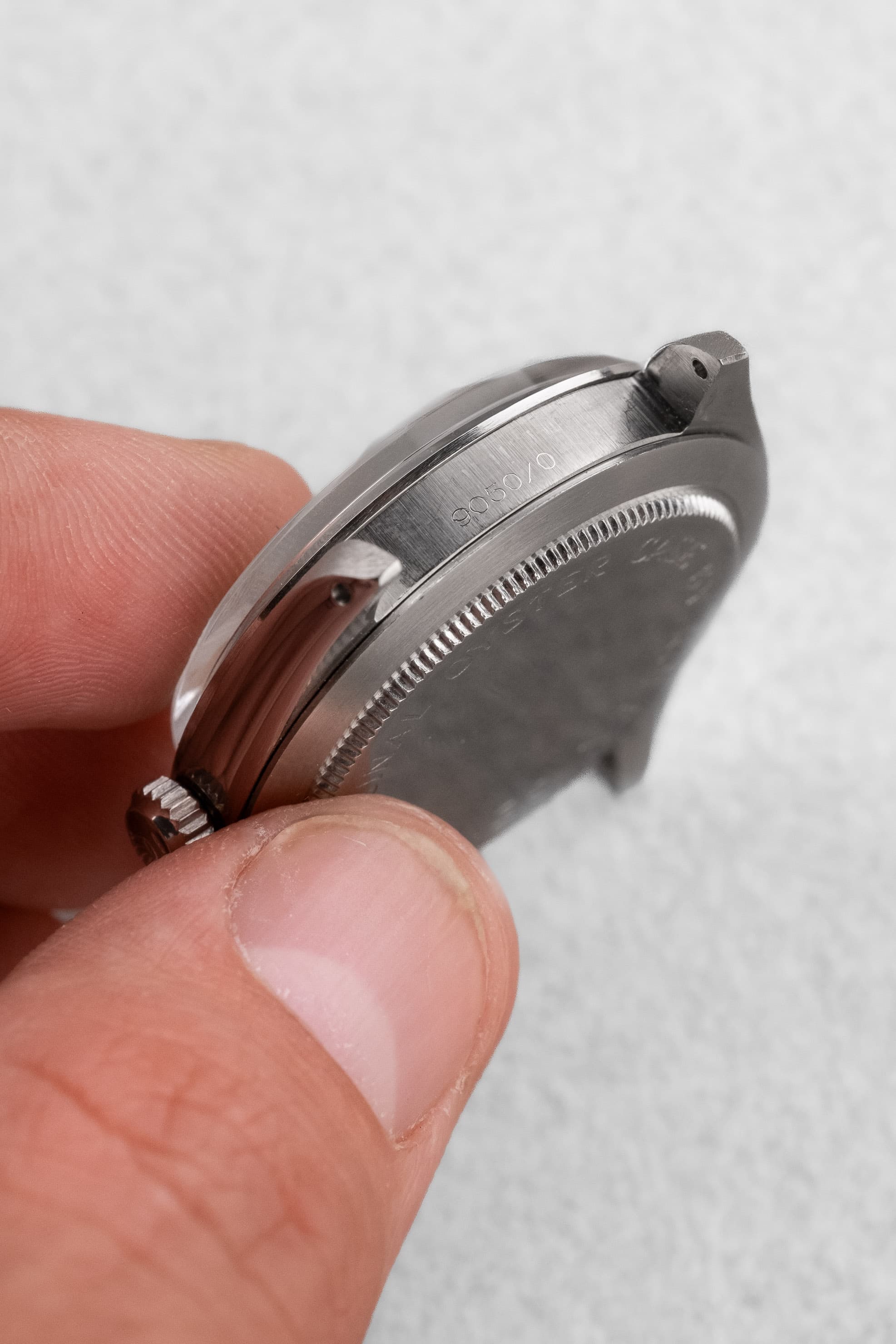 Les délimitations entre les surfaces mattes satinées/brossées et brillantes/polies miroir sont particulièrement nettes. De fait, cette montre n'avait jamais fait l'objet d'un quelconque polissage avant que nous l'acquissions.
