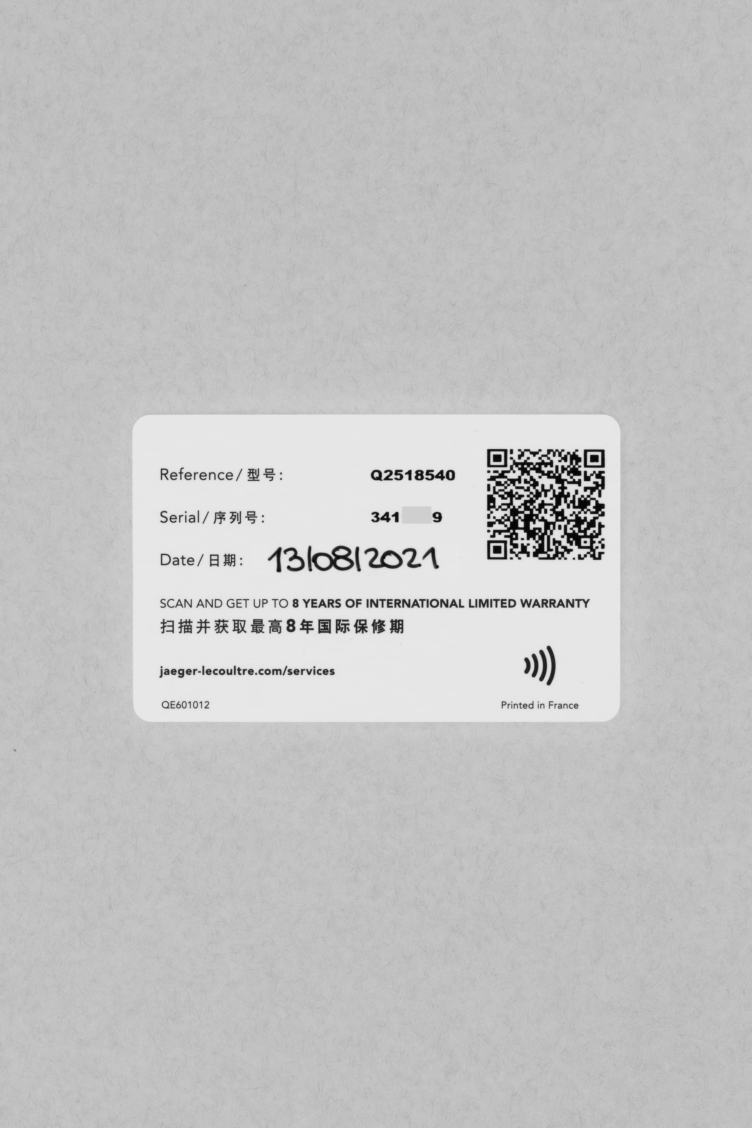 Delivered with: Original Jaeger-LeCoultre warranty card showing an initial sale on August 13, 2021, German retailer Chronext warranty card, Amplitude° Steel Warranty Card